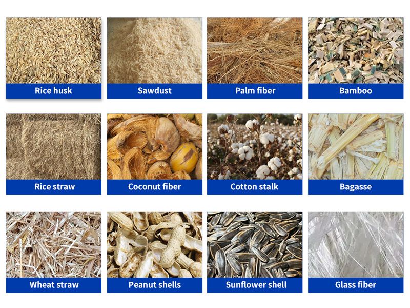 Various plant fiber raw materials can be used to make molded pallets: Rice husk, sawdust, palm, sugarcane, wheat straw, coconut shell, bamboo, straw, cotton stalk, peanut shell, melon seed shell, and waste wood.