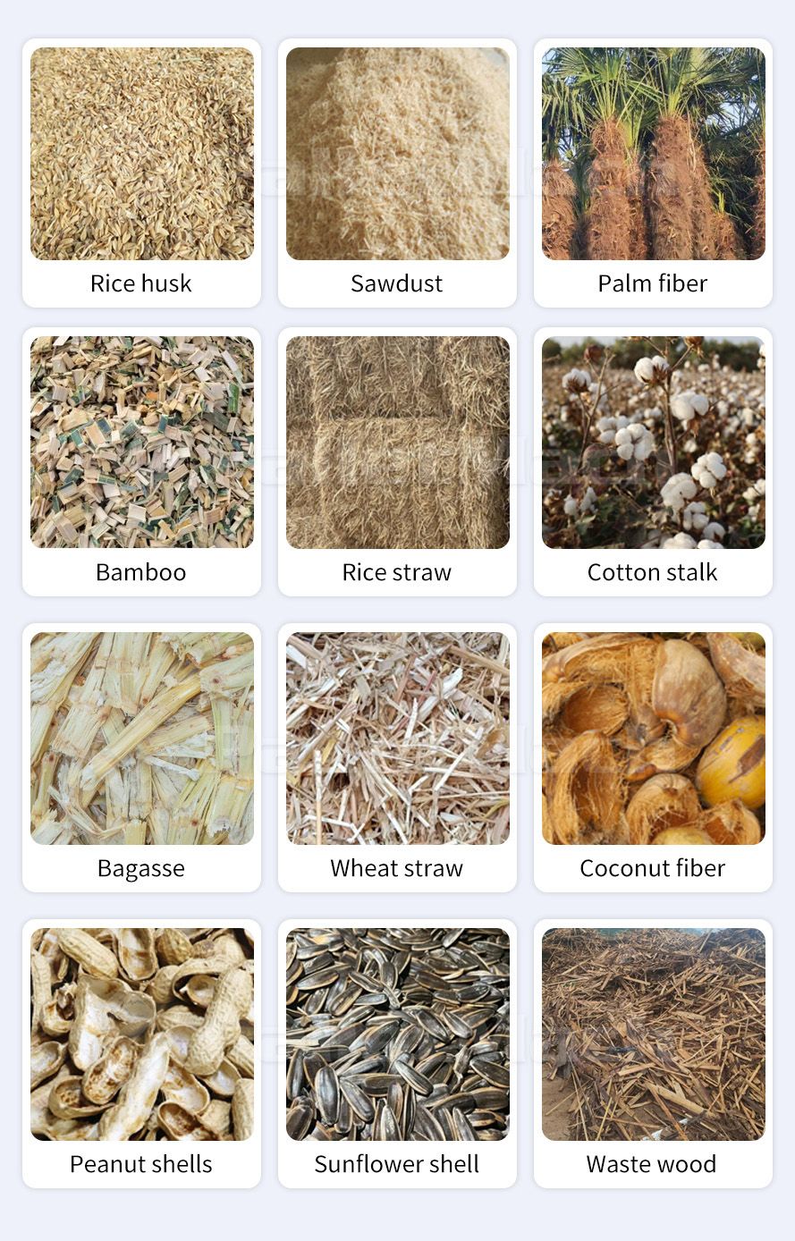 - Processing by-products like bagasse, peanut shells, and coconut shells