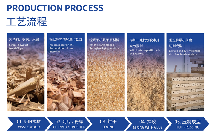Wide Raw Material Sources: Our pallet block machine processes various factory waste materials, including wood chips, planer shavings, and wood scraps