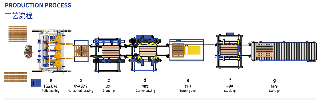 Our integrated systems cover every step of the manufacturing process, including panel cutting, block cutting, pallet leg nailing, slotting, chamfering, nailing, corner cutting, hot stamping, stacking, and more.