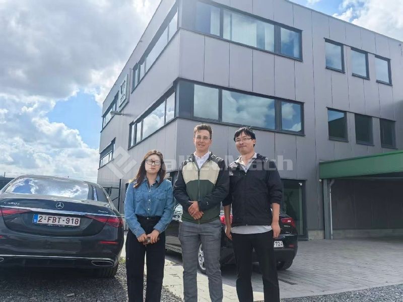 (photo of the PalletMach team with Belgian client)