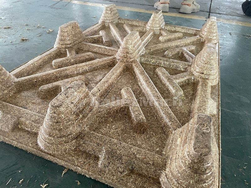 PalletMach’s plant fiber molding technology employs eco-friendly MDI adhesives combined with high-temperature and high-pressure processes, ensuring a tight bond of Miscanthus fibers. The performance of these pallets is comparable to that of traditional wood chip molding pallets.