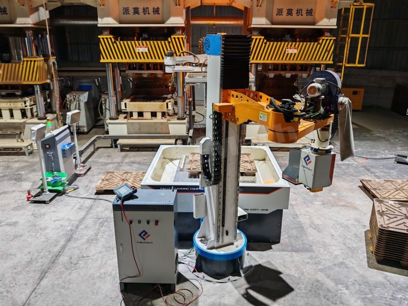 1. Loading: The palletizing robotic arm retrieves the freshly pressed pallets from the molding press.